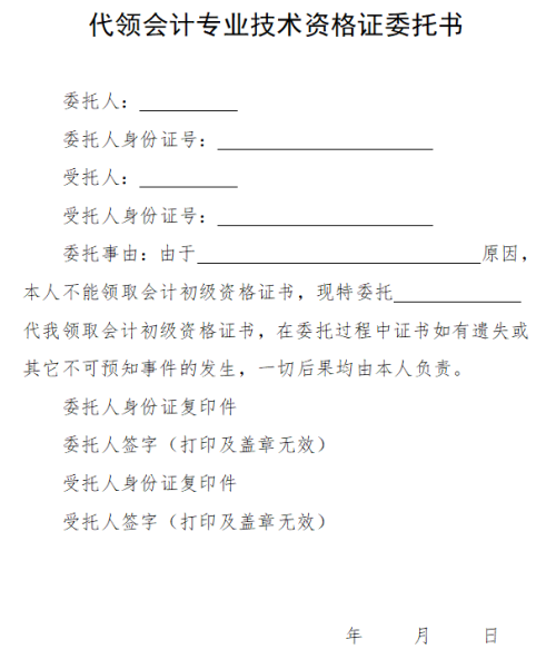 2、他人代领须提供:代领会计专业技术资格证委托书、双方身份证原件和复印件。严禁任何中介机构代领。