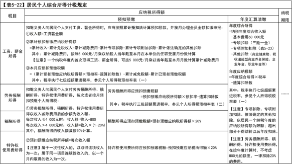 | 工资、薪金所得 | …… | 年度综合所得=纳税年度综合收入额 -基本费用60 000元 -专项扣除(三险一金) -专项附加扣除(表5-23) -其他扣除(商业健康险、税收递延型商业养老保险、企业年金、职业年金等) 年度应纳税额=年度综合所得×税率-速算扣除数 其中:税率执行七级超额累进税率,参见个人所得税税率表(一) 【注意】专项扣除、专项附加扣除、依法确定的其他扣除,以居民一个纳税年度的应纳税所得额为限额;超出部分不得结转以后年度扣除。 【注意】劳务报酬所得、稿酬所得、特许权使用费所得,在按年度计算时,不考虑800元的额度,一律扣除20%的费用。 | ①按年计算个人所得税; ②有扣缴义务人的,由扣缴义务人按月或者按次预扣预缴税款; ③需要办理汇算清缴的次年3月1日至6月30日内办理汇算清缴。 |