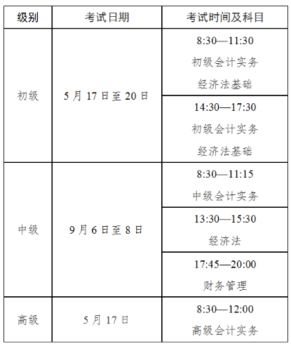 初级资格考试于2025年5月17日至20日举行,考试科目包括《初级会计实务》、《经济法基础》;中级资格考试于9月6日至8日举行,考试科目包括《中级会计实务》、《经济法》、《财务管理》;高级资格考试于5月17日举行,考试科目包括《高级会计实务》。具体安排如下: