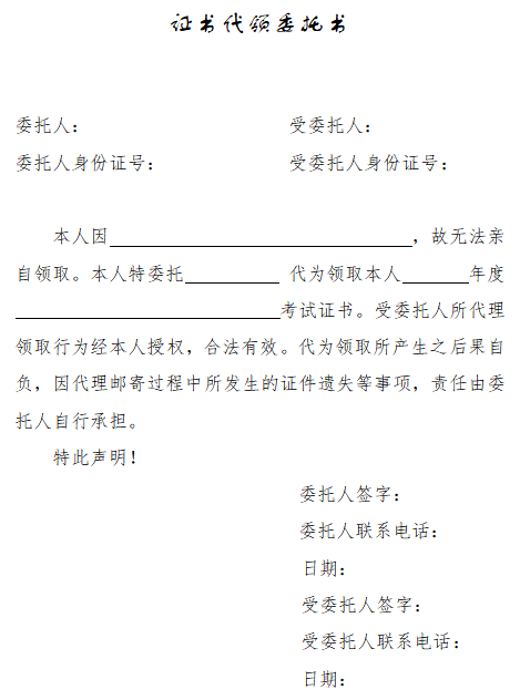 委托他人领取的,代领人须提供代领人二代身份证原件及复印件、考生身份证复印件及证书代领委托书(模板)。