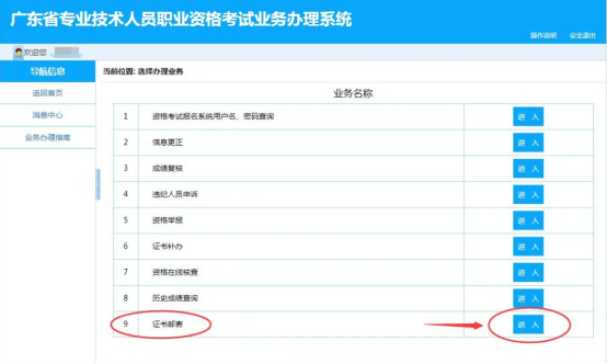 线下邮寄:考生可在任意时间通过广东省专业技术人员职业资格考试业务办理系统(http://123.56.228.71:82/)在线申请证书邮寄业务。(见下图,需用电脑操作)