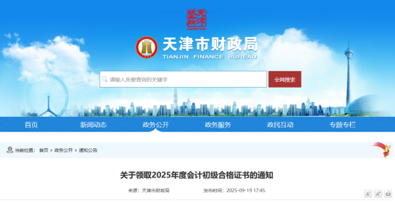 2025年度全国会计专业技术初级资格证书已制作完成,现将天津考区证书领取事项通知如下: