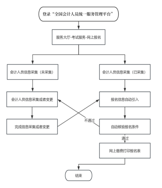 考试报名人员,必须在报名前登录“全国会计人员统一服务管理平台”(网址https://ausm.mof.gov.cn,以下简称平台),完成实名注册;其次,在平台“会计人员信息采集”模块完成个人信息采集;待信息采集审核通过后,于报名期间进入平台“会计专业技术资格考试”模块进行相关操作。报名审核采取“系统自动审核”的方式,“会计专业技术资格考试”模块自动调取“会计人员信息采集”模块的教育经历和工作经历等信息,对报名人员的报考条件进行自动核验。