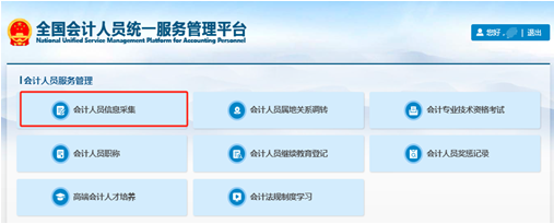 答:新用户在全国平台完成“注册-登录-实名认证”的准备工作后,点击首页的“会计人员信息采集”可进入到信息采集页面。(如何完成全国平台“注册-登录-实名认证”等准备工作,详见问题6)